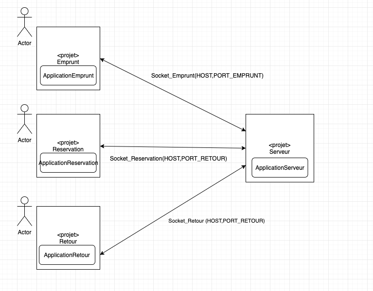 Pour notre projet il faudra donc avoir quatres projets distinct représant chacun un service pour le client, et l'autre projet sera celui du 'serveur' de la bibliothèque. Ces trois projets devront communiquément entres-eux uniquement par les objets sockets. L'applicationServeur une fois lancé lancera trois 'Serveurs' d'écoutes de chacun des différents services. On pourra donc communiquer en permanence avec le Serveur à moins qu'il ne soit interrompue.