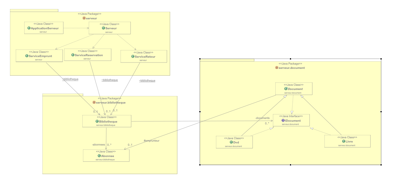 }Comme nous pouvons le voir le constructeur de la classe 'Serveur' prend la ressource partagée 'Bibliotheque' en parametre, pour après la redistribuée à ses différents 'Service'. Cependant la classe 'Serveur' n'a rien avoir avec la ressource partagée qui devrait seulement être présente dans les 'Service'. Il fallait donc plutôt créer un jeu de documents en dur dans la classe 'ApplicationServeur' et passer la réféféremce de ces documents via un sette static.