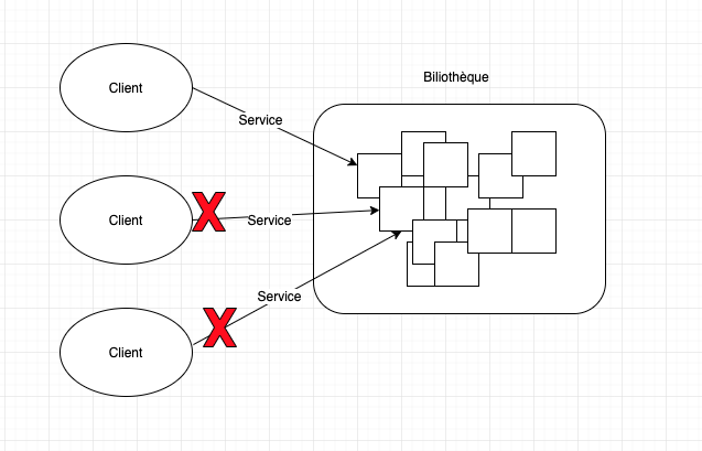 Au début de notre projet nous avions créer une classe 'Bibliotheque' contenant tous nos documents, et qui constituée notre ressource partagée. Nous obtenions donc le code suivant lorsque nous voulions donner cette ressource partagée aux trois services 'emprunt', 'retour', et 'reservation' :