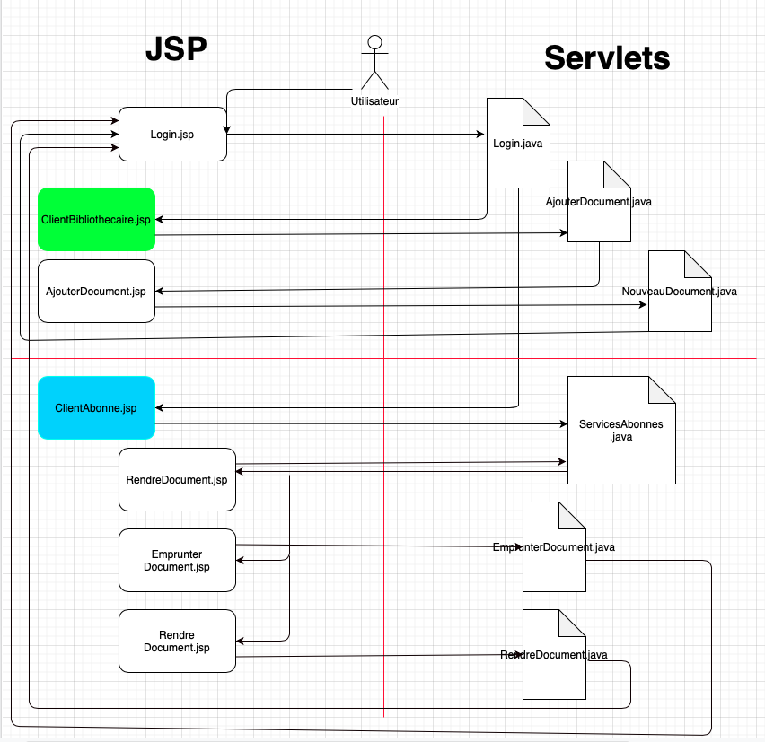 les flèches de JSP vers SERVLET sont des requêtes DOPOST et les flèches de SERVLET vers JSP sont des getRequestDIspatcher